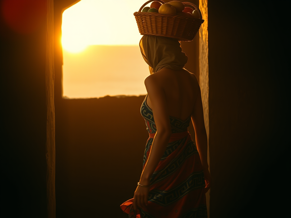 A swishing sound caught the naked Amir off guard. He looked out the portal in time to see a slender woman ablaze in the fading light of day. She wore an unorthodox ankle-length dress. The dress was a maze of Egyptian patterns in blue and black, contrasted with orange and yellow. Her short and rapid steps set the creases of her dress, rippling in slow motion. A scarf covered her head, marking her as an unmarried woman. On top of her head was a hand-woven basket filled with fresh vegetables and fruit from the market.